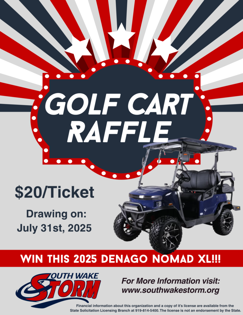 The South Wake Storm Softball and Baseball athletes will be selling a limited number of tickets for our most popular raffle! One lucky winner will ride in style behind the wheel of a new 2025 Denago Nomad XL. Local (greater Raleigh) delivery included!
